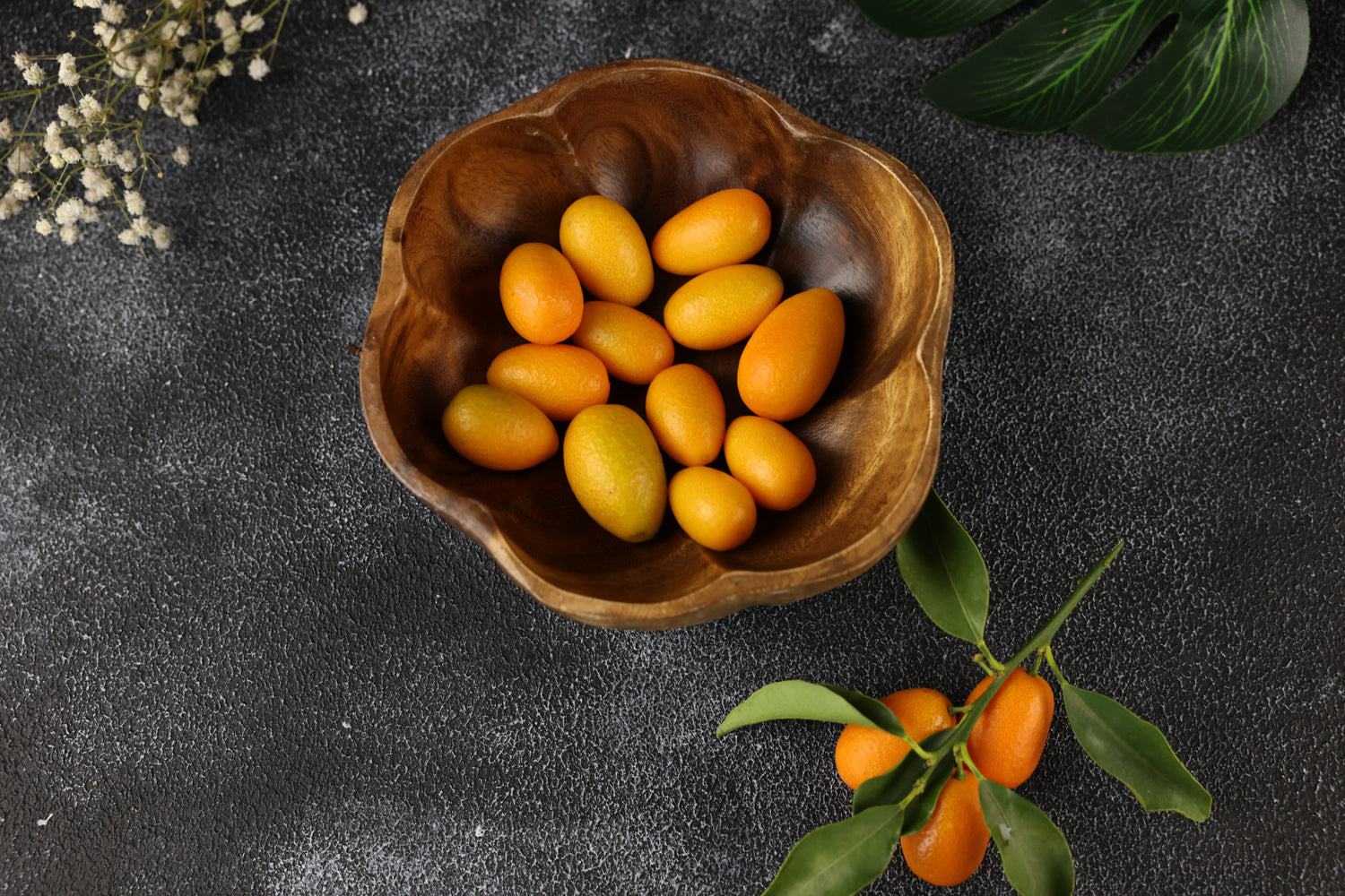 - Sculpted wooden bowl with a floral-inspired design